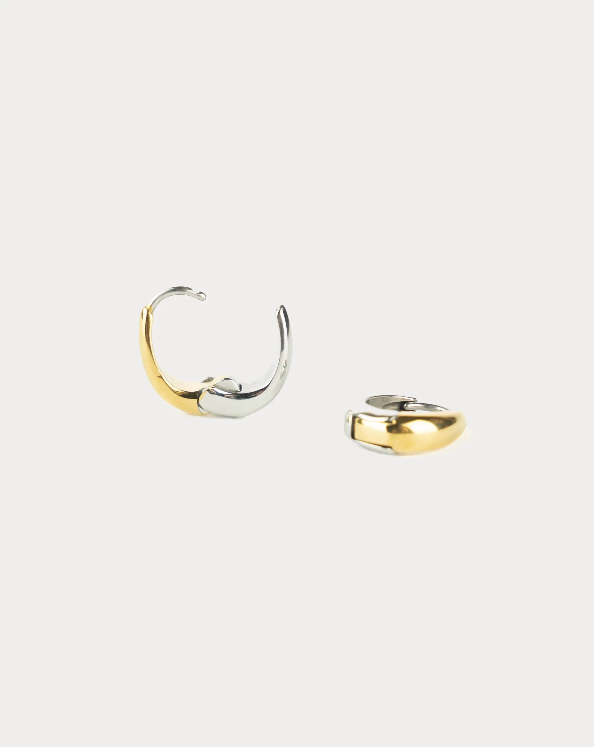 Orecchini cerchietto da donna con chiusura a scatto. Doppio colore oro e argento, acciaio inox placcato oro 18K.