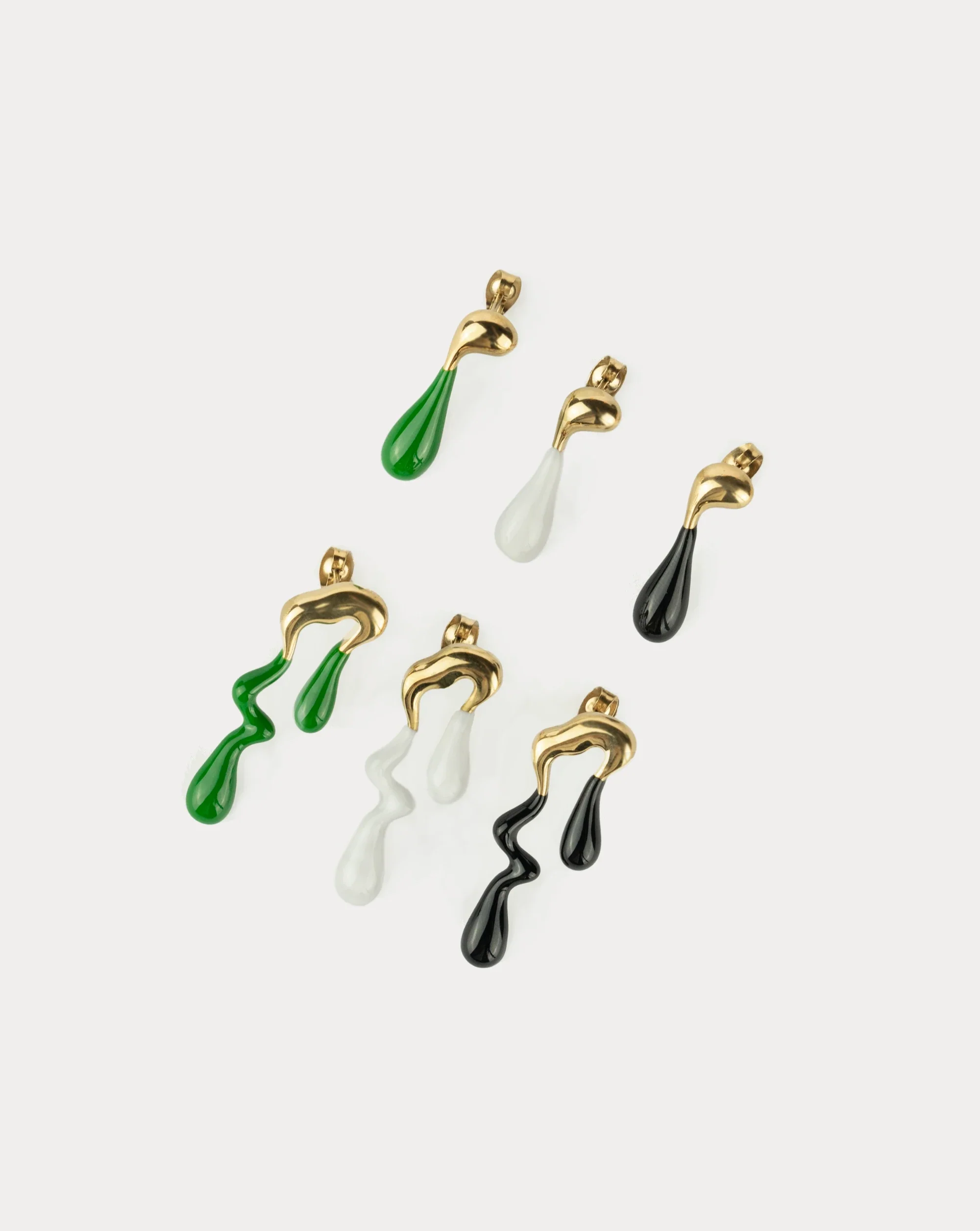 Design: orecchini pendenti con design fluido e irregolare a forma di gocce d'acqua, disponibili in tre varianti di colore: verde, bianco e nero